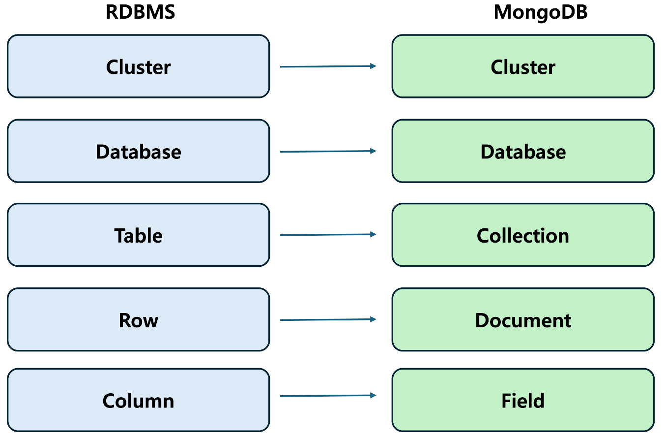 위 사진에서 알 수 있듯이 RDBMS에서의 Table, Row, Column이 각각 Collection, Document, Field에 해당한다.