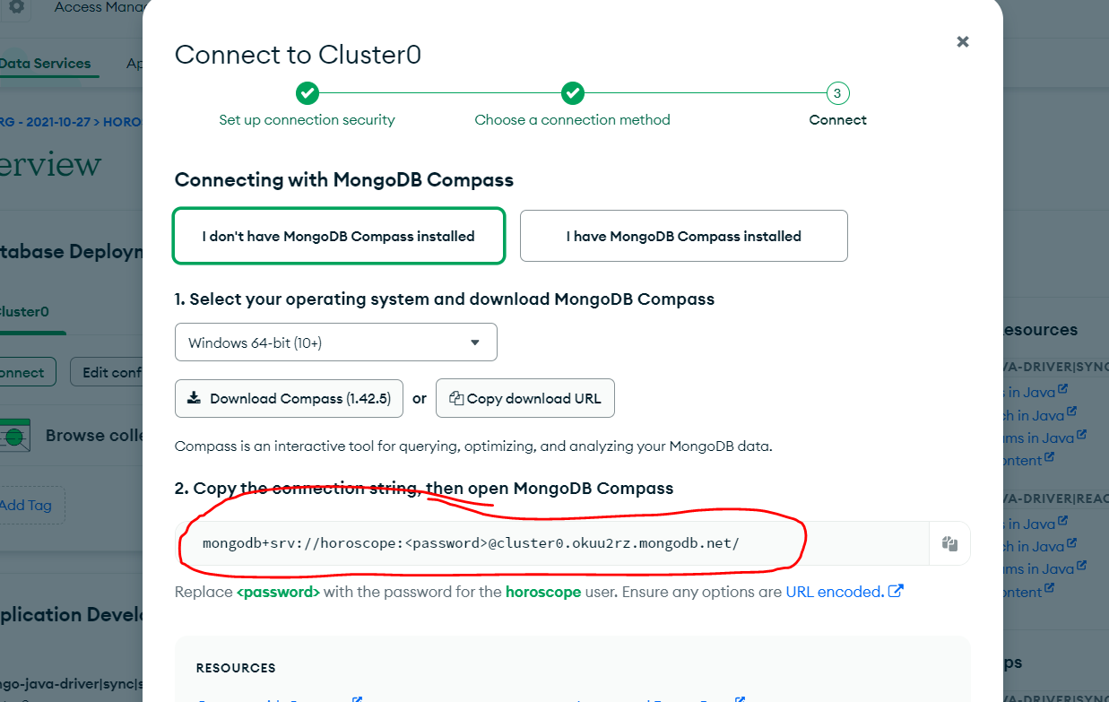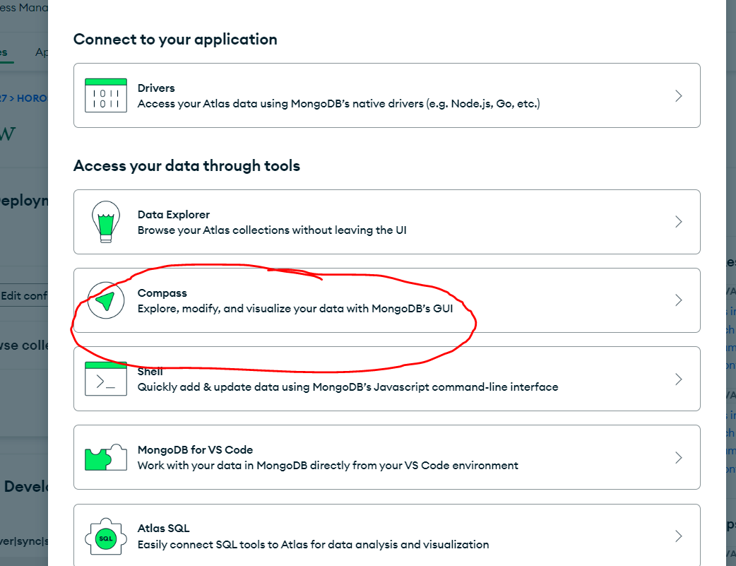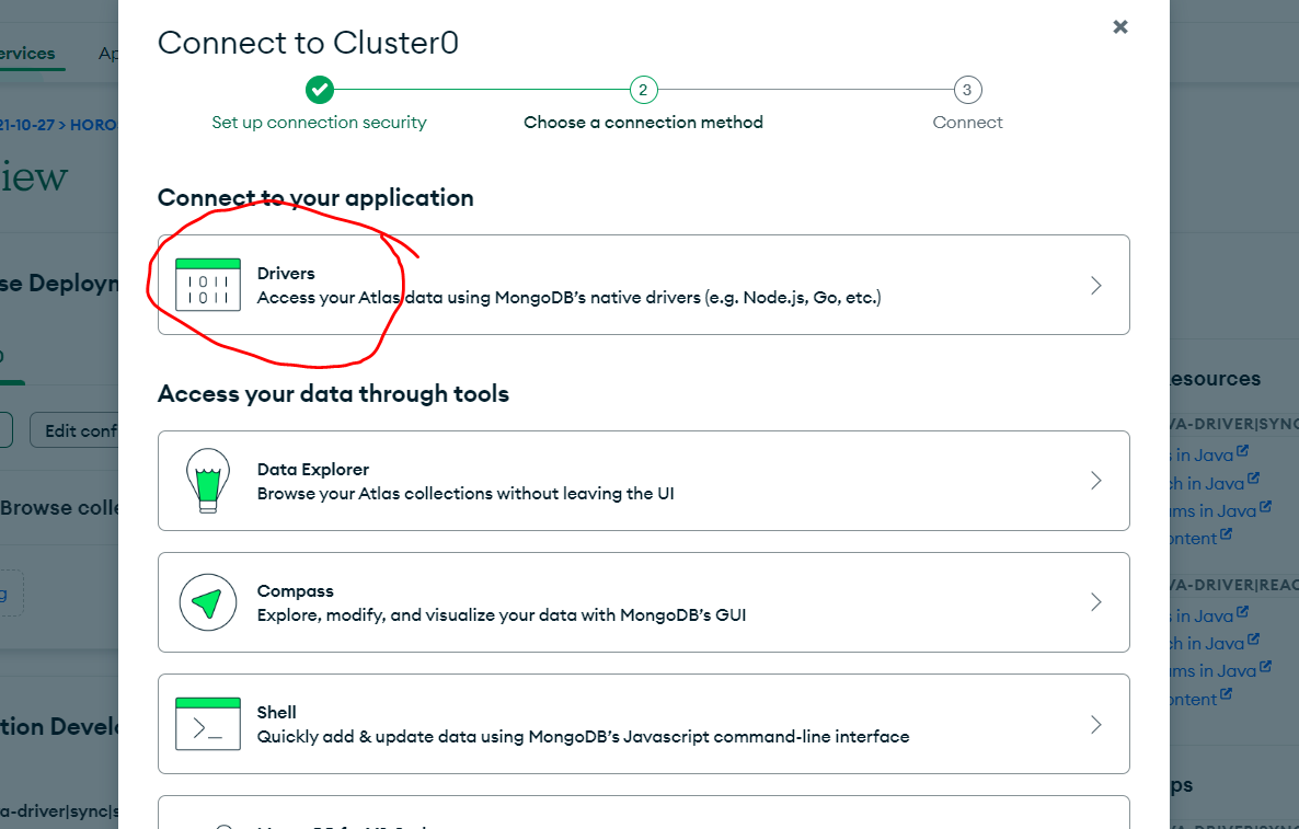 아래와 같이 여러 연결 방식이 있는데, Compass를 클릭하고 다운로드를 한다.(참고로 이후 Spring boot와 연동하기 위해서 Drivers를 통해 설정정보를 확인할 것이다.)