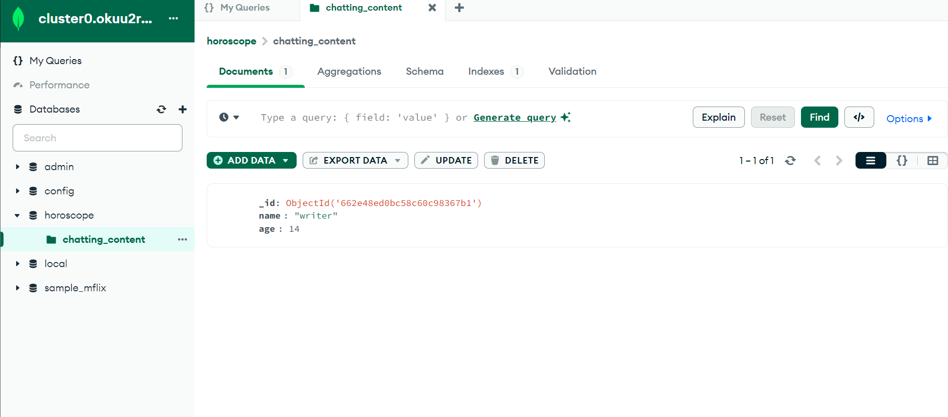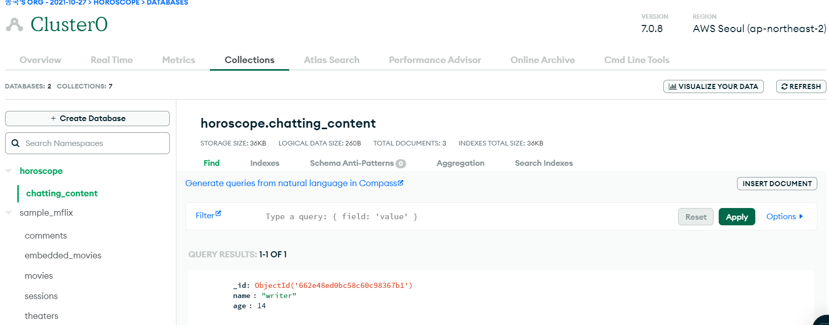이렇게 MongoDB와 연동을 했으니 본격적으로 데이터를 저장하고 조회해 보자.