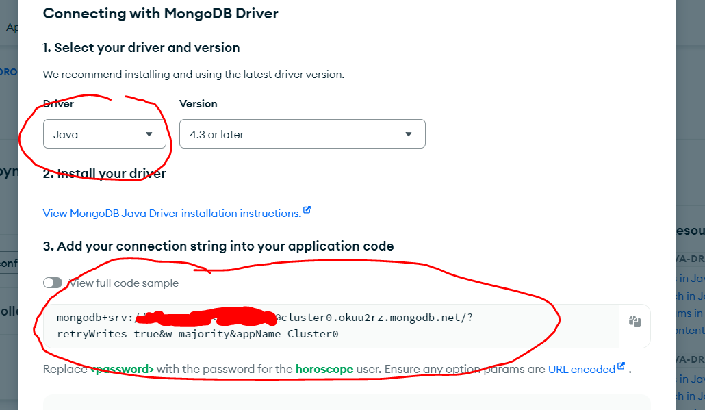 이후 Driver를 Java로 변경한 후 아래의 코드를 복사한다. 주의할 것은 아래의 코드는 user, password 뿐만 아니라 uri 자체로 사용자마다 다르게 만들어지므로 다른 사람의 uri에 user, password만 다르게 설정한다면 MongoDB에 연결이 되지 않을 것이다.