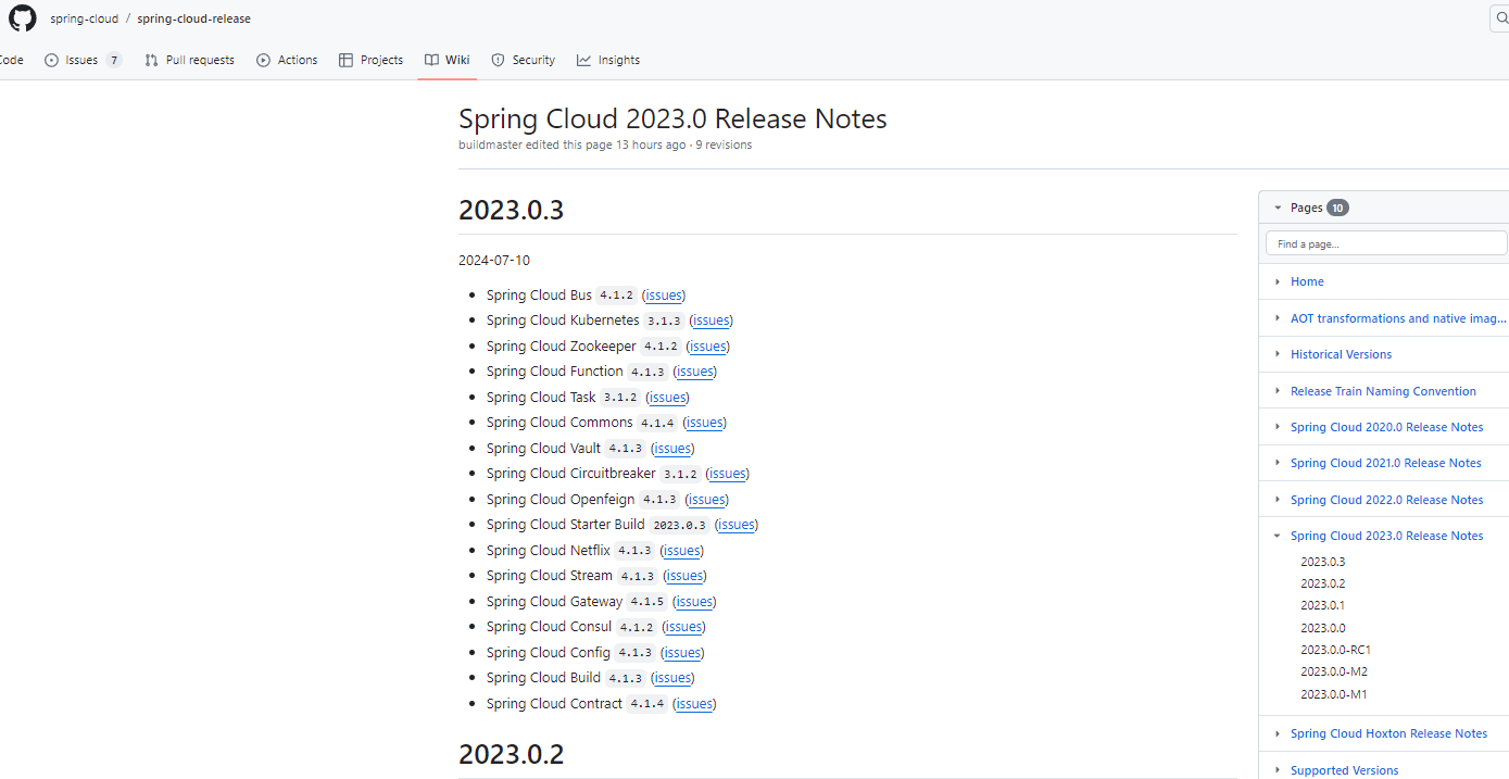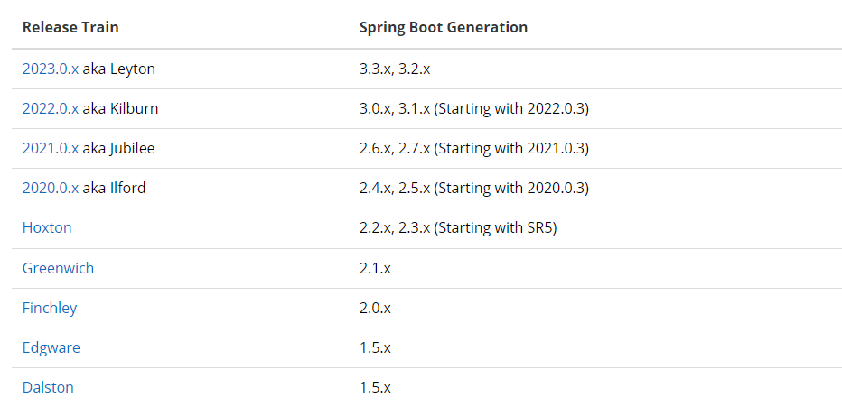 스프링 클라우드 버전은 여기서 확인 가능하다. 현재 필자가 진행하는 Spring Boot의 버전은 3.2.5이기에 2023.0.3을 적용하였다.