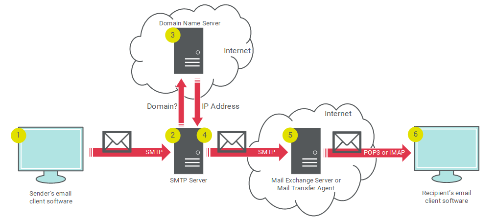 3. SMTP 서버는 도메인 이름 서버(DNS)를 통해 수신자의 도메인을 조회하고, 수신자의 이메일 교환 서버(Mail Exchange Server)의 물리적 주소를 식별하려고 시도한다.