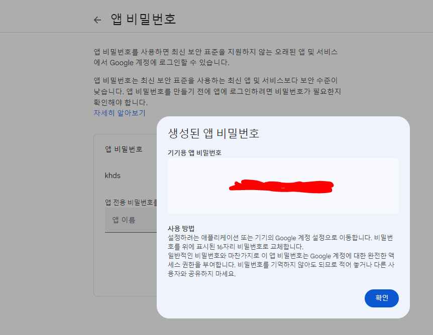 이후 앱 비밀번호를 설정해야 하는데, SMTP 라이브러리를 사용할 때 비밀번호 대신 사용된다.