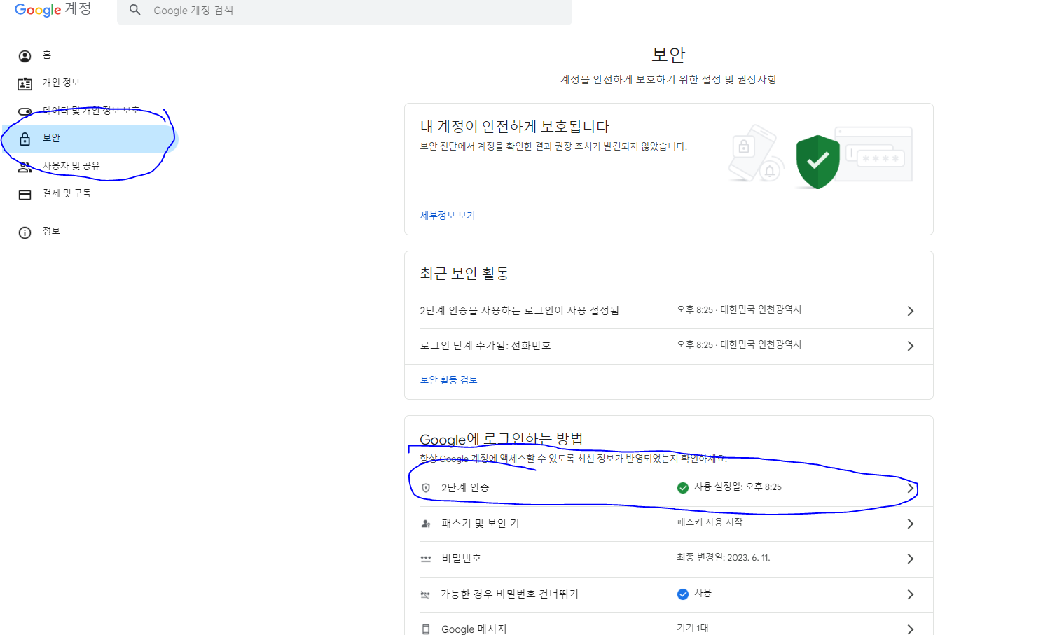 첫번째로 2단계 인증을 활성화해야 한다. 아래 사진과 같이 나오면 2단계 인증이 완료된 상태다.
