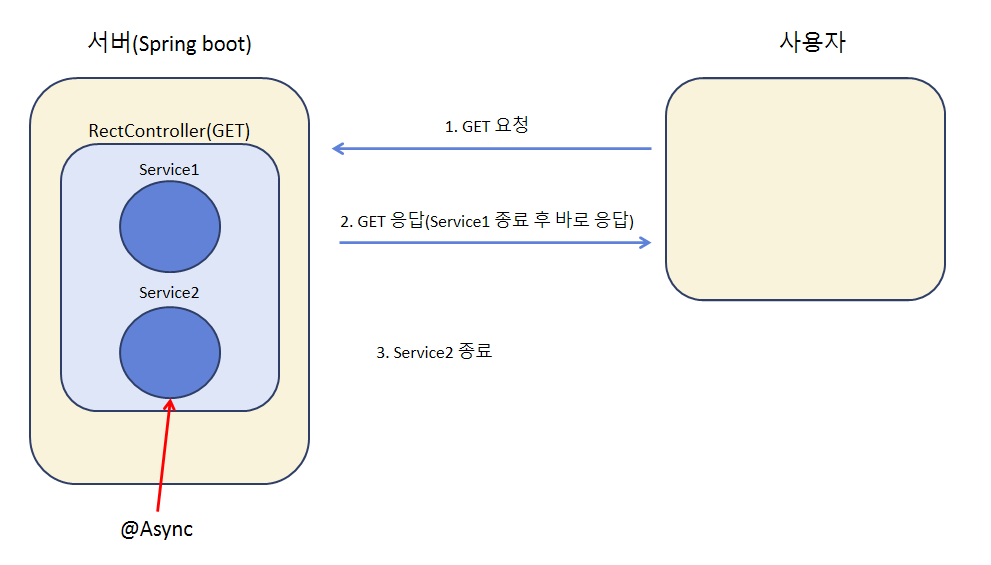 @Async 어노테이션이 추가된 메서드는 별도의 스레드에서 실행되므로, 사용자는 해당 메서드가 종료되기 전에 응답을 받을 수 있고, 비동기로 동작하는 메서드는 뒤늦게 종료될 수 있는 것이다.)