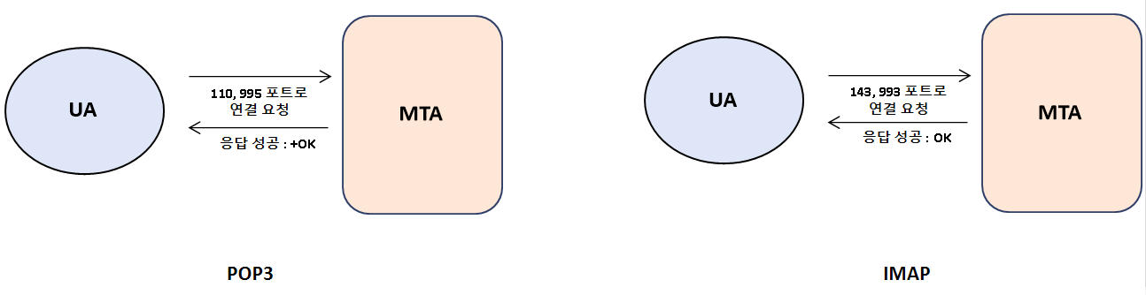 POP3, IMAP도 SMTP와 유사하게 연결, 데이터 처리, 연결 종료 흐름을 명령과 응답을 통해 진행된다. 그런데 연결을 요청하는 주체는 MTA가 아니다. UA이다. 이는 UA가 사용자의 명령을 받아 이메일을 서버에서 가져오거나 관리하는 역할을 하기 때문이다.