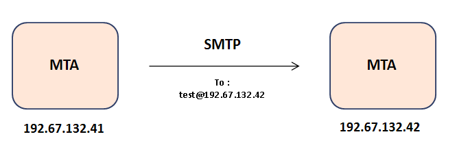 예를 들어 192.67.132.41, 192.67.132.42라는 IP로 MTA를 운영하고 있고, 첫 번째 서버에서 두 번째 IP 서버의 test라는 호스트에게 메일 전송을 한다고 하면, 수신자는 'test@192.67.132.42'로 설정하여 SMTP 통신을 하는 것이다.