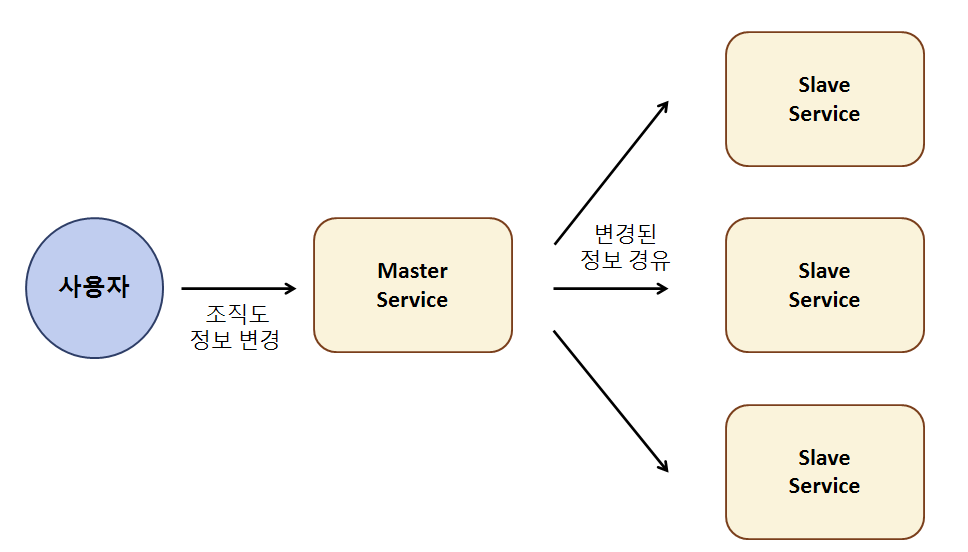 물론 이 방법이 무조건 좋은 것은 아니다. 상황에 따라 다를 수 있다. 마스터 슬레이브 구분 없이, 아무 서비스에서 조직도를 변경하면 다른 서비스들도 모두 반영되도록 할 수도 있는 것이다.