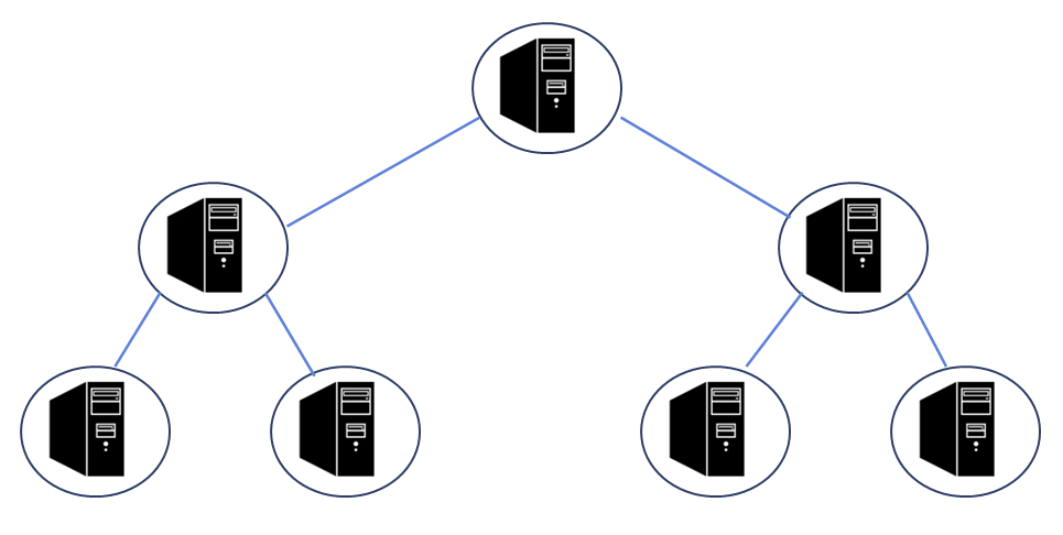 트리 토폴로지는 계층형 토폴로지라고 하며 트리 형태로 배치한 네트워크 구성을 의미한다. 노드의 추가, 삭제가 쉽지만 특정 노드에 부하가 있을 시 하위 노드에 영향을 줄 수 있다.