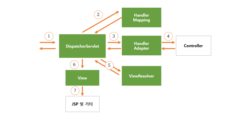 1. 스프링 MVC에서 사용자의 Request는 Front-Controller인 DispatcherServlet을 통해서 처리한다. Front-Controller는 주로 서블릿 컨테이너의 가장 앞단에서 클라이언트가 서버로 전달하는 모든 요청을 받아서 처리해주는 컨트롤러인데 이로 인하여 각각의 요청이 오면 URL에 따라 구분하는 것이 아니라 하나의 서블릿으로 받고 해당되는 컨트롤러에 요청을 위임해주는 것이다.