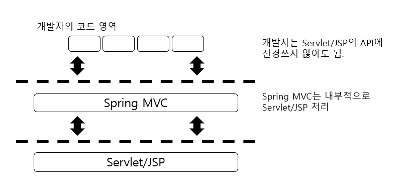 스프링 MVC를 이용하게 되면 개발자들은 직접적으로 HttpServletRequest/HttpServletResponse 등과 같이 Servlet/JSP의 API를 사용할 필요가 없어진다. 스프링은 중간 연결 역할을 하기 때문에 이러한 코드를 작성하지 않아도 되는 것이다.