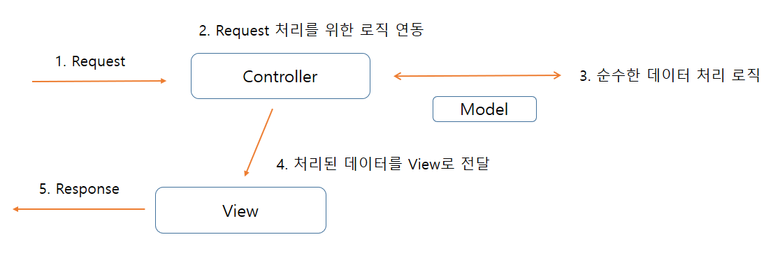 모델 2 방식에서 사용자의 Request는 특별한 상황이 아닌 이상 먼저 Controller를 호출하게 된다. 이렇게 설계하는 가장 큰 이유는 나중에 View를 수정하여도 사용자가 호출하는 URL 자체에는 아무 변화가 없게 하기 위해서이다. 컨트롤러는 데이터를 처리하는 존재로 데이터(Model)를 처리하고 View로 Response를 위한 데이터를 넘겨주게 된다. Servlet를 이용하는 경우 개발자들은 Servlet API의 RequestDispatcher 등을 이용해서 이를 직접 처리해 왔지만 스프링 MVC는 내부에서 이러한 처리를 하고, 개발자들은 스프링 MVC의 API를 이용해서 코드를 작성하면 된다.