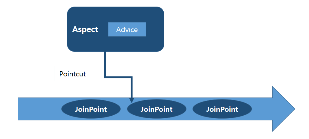 JoinPoint는 Target이 가진 여러 메서드이며 어떤 메서드에 관심사를 결합할 것인지를 'Pointcut'이라고 한다. Pointcut은 관심사와 비즈니스 로직이 결합되는 지점을 결정하는 것이다. 앞에 Proxy는 이 결합이 완성된 상태이므로 메서드를 호출하게 되면 자동으로 관심사가 결합된 상태도 동작하게 된다. 관심사는 Aspect이며 이는 추상적인 개념이고 이를 구현한 코드가 Advice이다.