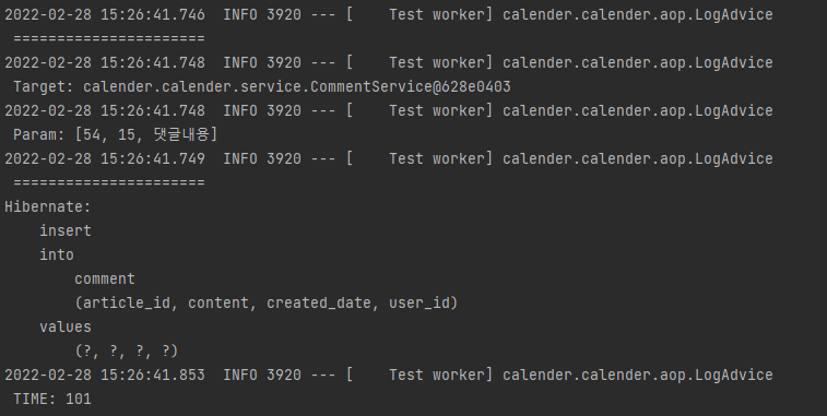결과를 보면 service 실행 전에 Target과 Param을 출력하고 pjp.proceed()를 통해 메서드를 실행 전 위에서 설정한 @Before가 실행된다. 그리고 서비스 내용은 insert가 실행되고 서비스 종료 후에는 Time이 출력되는 것을 알 수 있다.