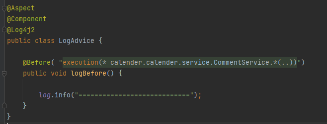 의존성을 추가해 주었다면 aop 패키지를 만들고 그 안에 Advice 클래스를 생성한다. 서비스 메서드에는 아무것도 추가 작성하지 않아도 된다. 아래 예시는 서비스가 실행 전에 로그를 출력해주는 예시이다.