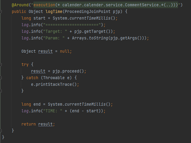 @Around 메서드는 리턴 타입이 void가 아닌 타입으로 설정하고, 메서드의 실행 결과 역시 직접 반환하는 형태가 되어야 한다. 매개변수로 ProceedingJoinPoint라는 파라미터를 지정하는데, 이는 AOP의 대상이 되는 Target나 파라미터 등을 파악할 뿐만 아니라, 직접 실행을 결정할 수 있다. 위의 실행 결과는 아래와 같다.