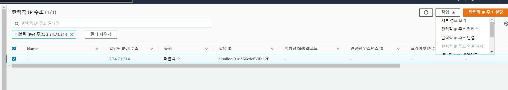 인스턴스를 생성한다음 탄력적 Ip주소를 할당하자. 기본적으로 생성되는 인스턴스의 주소는 인스턴스를 정지했다 다시킬때마다 IP주소의 변동이 생기므로 항상 고정되어있는 탄력젹 Ip주소를 지정해주는 것이 좋다.