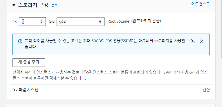 프리티어에서 스토리지는 모든 인스턴스 합쳐서 최대 30GB까지 사용할 수 있다. 여유있게 10GB정도씩 설정하자.