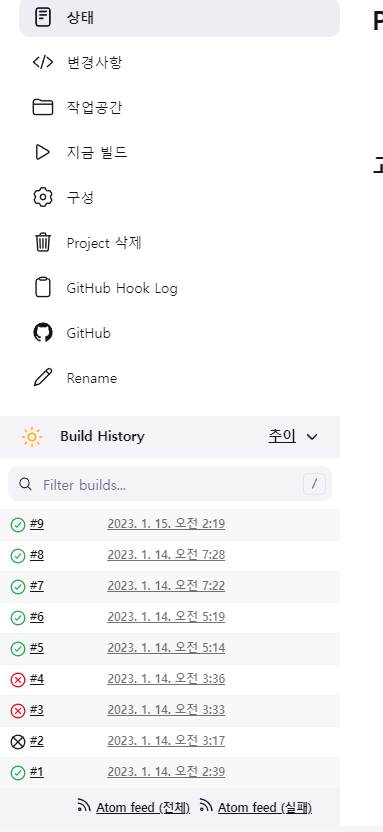이후 '지금 빌드'를 클릭함으로서 build를 진행하여 성공하는 것을 볼 수있다. 아래는 여러번 시도한 사진이고 각 빌드마다 체크표시가 생기면 테스트 및 빌드가 성공인 것이다.