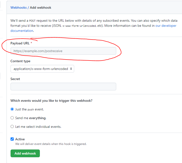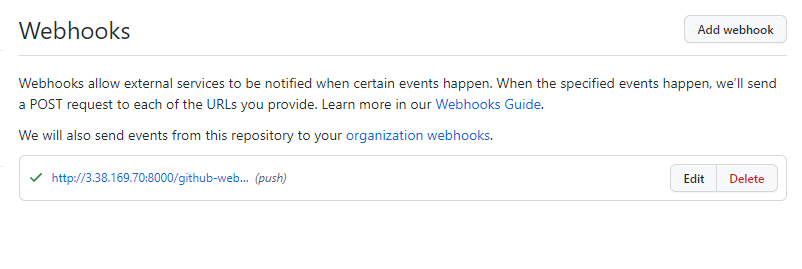 Add webhooks를 클릭 후 Payload URL만 수정후 Add webhooks를 클릭하면 된다. Payload URL은 http://jenkins주소:8000/github-webhook/ 으로 하면 된다.