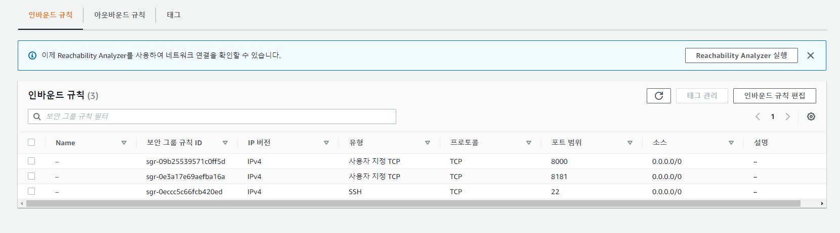 넘어간 후 인바운드 규칙 편집을 눌러서 접속을 원하는 포트를 설정을 해주면 된다. 아래는 예시 사진이다.