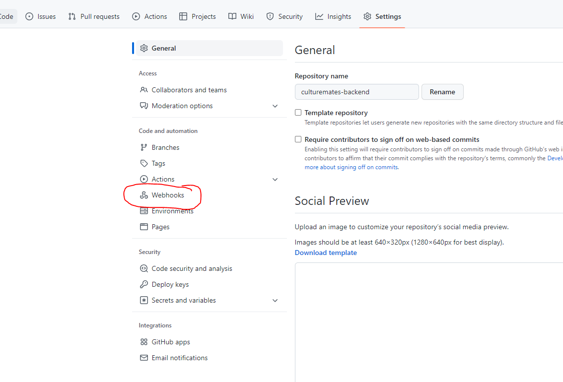 그리고 CI/CD를 원하는 github repository에 Settings에 들어간 후 Webhooks를 클릭한다.