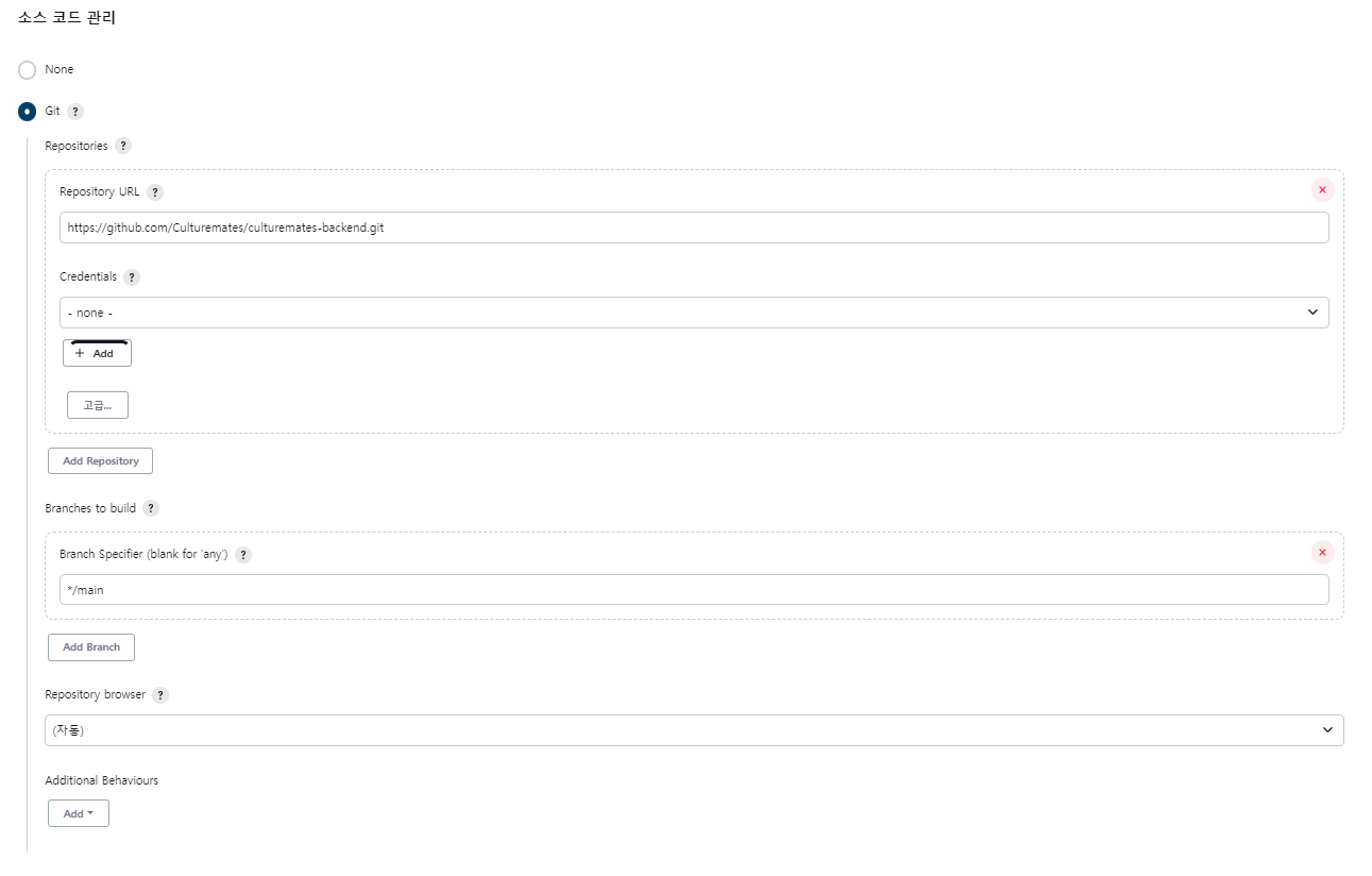 소스 코드 관리에서 git을 체크 후 repository url을 입력한다. 브랜치는 어느 브랜치에 push or merge가 이뤄지면 CI/CD를 실행할 지 설정하는 것이다.
