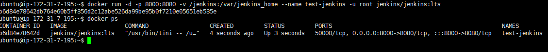 docker run -d -p 8000:8080 -v /jenkins:/var/jenkins_home --name test-jenkins -u root jenkins/jenkins:lts