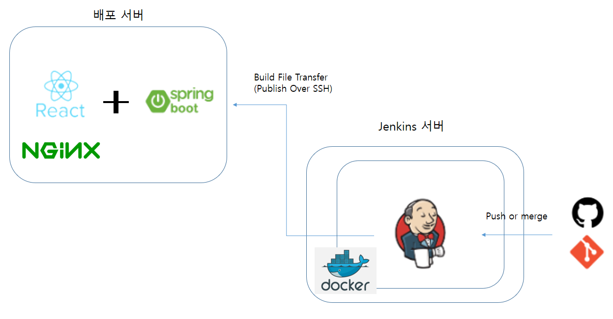 위 사진과같이 서버는 jenkins가 있는 서버, 실질적인 배포가 이루어진 서버 2개를 활용하여 구성을 할 것이다. 하나의 서버에서 jenkins와 배포를 동시에 이뤄지게는 거의 안한다고 한다. aws 프리티어 사용자도 2개의 서버로 구현하기에 충분하므로 2개를 이용하는 것을 권장하지만 혹시나 하나의 서버에서 돌리고 싶으면 아래의 주소에서 확인하길 바란다.