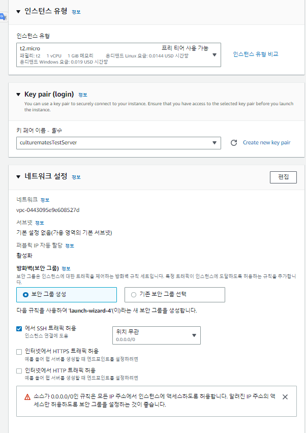 위와 같이 설정을 하고 키페어는 생성해둔게 없으면 Create new key pair를 클릭하여 생성하고 다운받길 바란다.