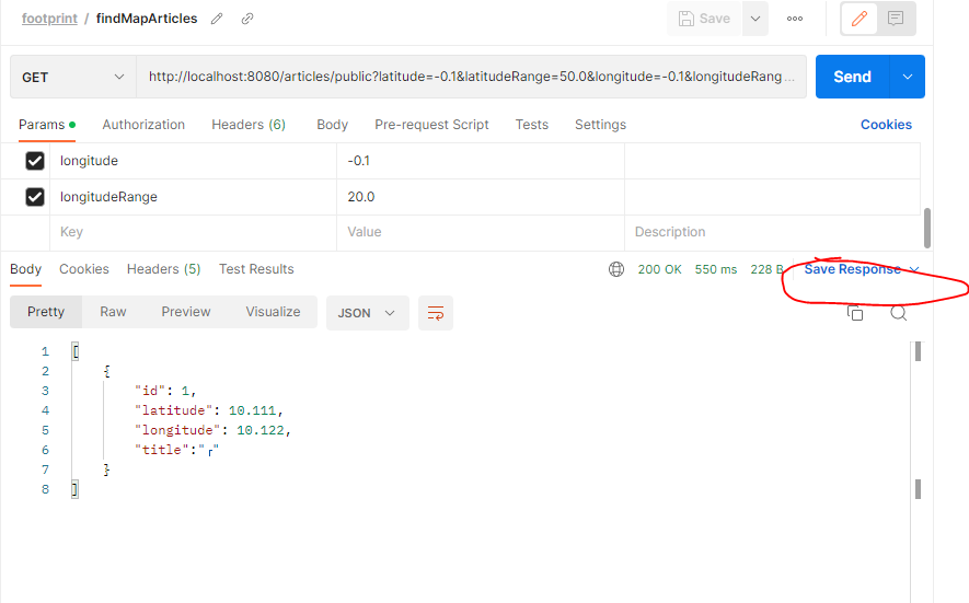 이후 Response가 나오는 화면에 우측에 Save Response를 클릭하여 Save as example를 클릭하여 예시를 저장한다.