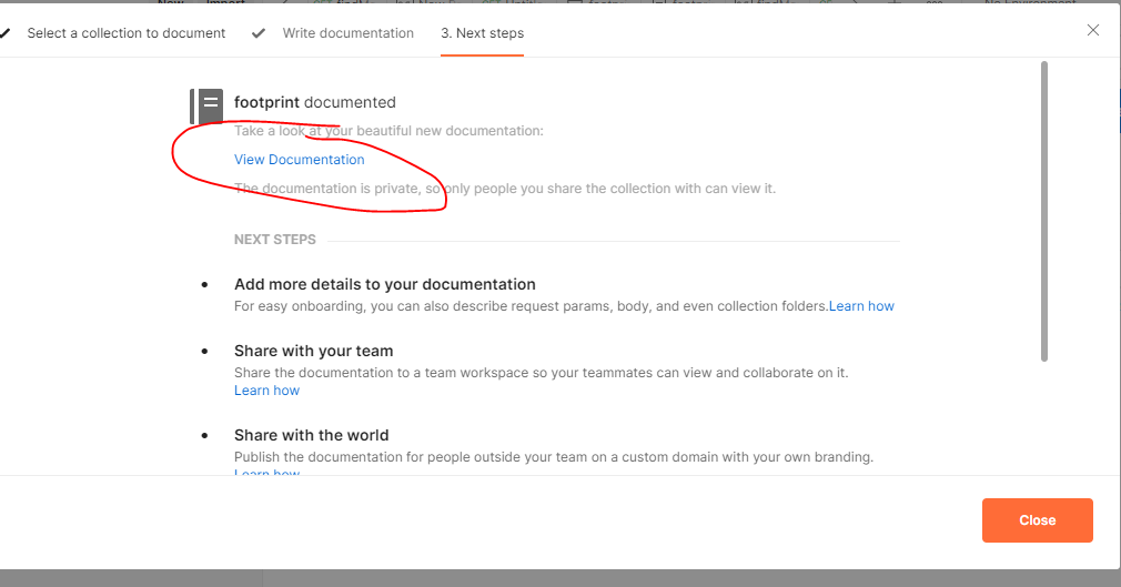 save를 누르면 아래와 같이 view documentation 이 나오는데 위 문서는 아직 workspace 내에서만 볼 수 있다.