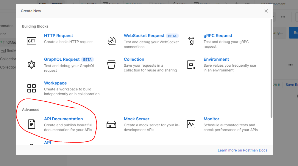 이제 작성한 request들이 들어있는 collection을 문서로 만들어보자. 좌측에 My Workspace옆에 New 를 클릭하여 API Documentation을 클릭하자.