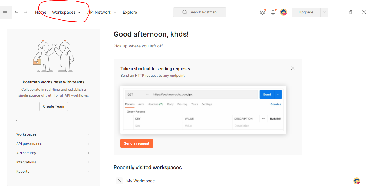 먼저 Postman에 들어간다. workspace가 없다면 workspace를 생성한다.
