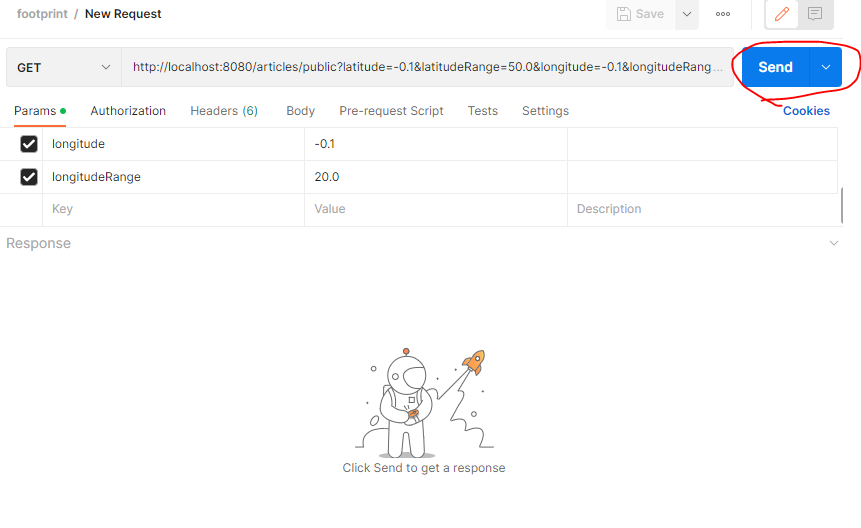 클릭한 후 아래와 같이 Http Method 및 파라미터, body, header 등 필요한 정보들을 기입한 후 send를 누르면 response이 출력된다. 여기서 주의할 것은 url이 있는 서버가 실행되고 있어야 한다.