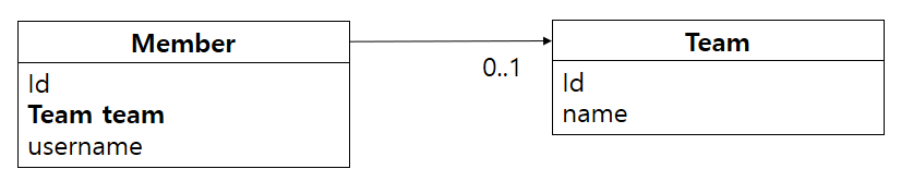 객체 연관관계로 따지면 Member 객체는 Member.team 필드로 Team 객체와 참조(주소)로 단방향 연관관계를 맺으며 member는 team필드로 Team을 알 수 있지만 Team은 Member을 알 수 없다.
