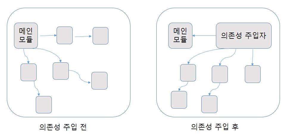 위의 그림처럼 메인 모듈이 직접 다른 하위 모듈에 의존성을 주기보다는 중간에 의존성 주입자가 이 부분을 가로채 메인 모듈이 간접적으로 의존성을 주입하는 방식이다. 이를 통해 메인 모듈은 하위 모듈에 대한 의존성이 떨어지게 된다.
