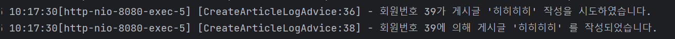log.info("회원번호 " + memberId + "에 의해 " + "게시글 " + articleId + "에 " + method.getName()