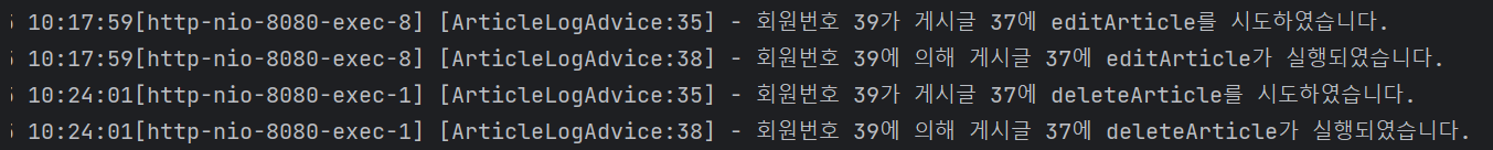 비지니스 메서드 실행 전 "회원 (회원 번호)가 게시글 (게시글 번호)에 (비즈니스 메서드 이름)을 시도하였습니다." 로그를 출력하고 실행 후 "회원 (회원번호)에 의해 게시글 (게시글 번호)에 (비지니스 메서드 이름)가 실행되었습니다."를 출력하고 싶다. 그래서 메서드 실행 중 에러가 생기면 시도하였다는 로그만 출력되고 에러메시디가 출력이 될 것이다.