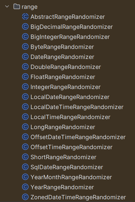 다른 타입들도 위와 같이 되지 않을까? 하여 객체를 자세히 확인해 보니 AbstractRangeRandomizer라는 추상 클래스를 상속하고 있었다. 매개변수 타입은 <T>로 제네틱 타입으로 구현되어 있기에 다른 타입 또한 구현체로서 구현되어 있을 것이라는 생각을 하였다. 실제로 폴더 내부를 확인해 보니 아래와 같이 다양한 타입으로 존재하는 것을 확인할 수 있었다.