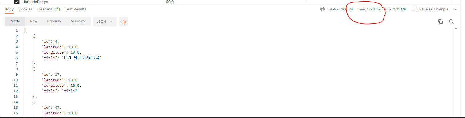 위 코드는 public_map 값이 true이고 latitude(위도)와 longitude(경도)가 주어진 범위에 있는 게시글을 조회하는 쿼리이다.