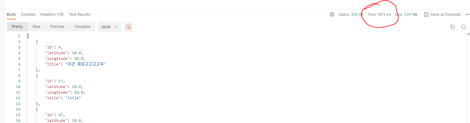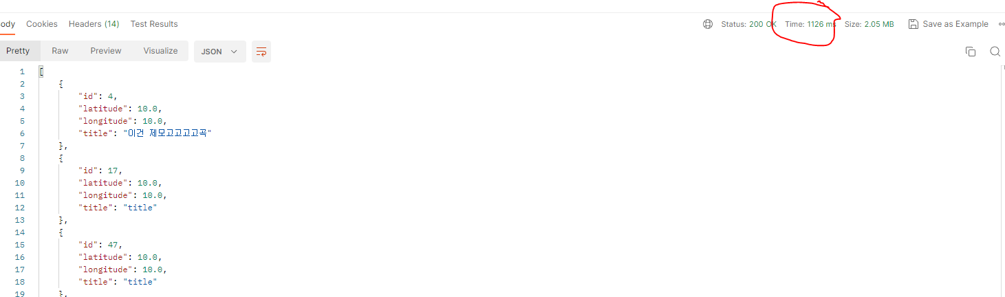 1번 결과와 비교했을 때 3번 결과는 확실히 범위 측면에서 크게 줄여주었기에 랜덤 엑세스 수가 적어져 속도가 더 빨라졌다. 이를 통해 알 수 있는 것은 public_map보다 latitude, longitude가 확인해야할 데이터를 더 줄여준다는 것을 알 수 있다.