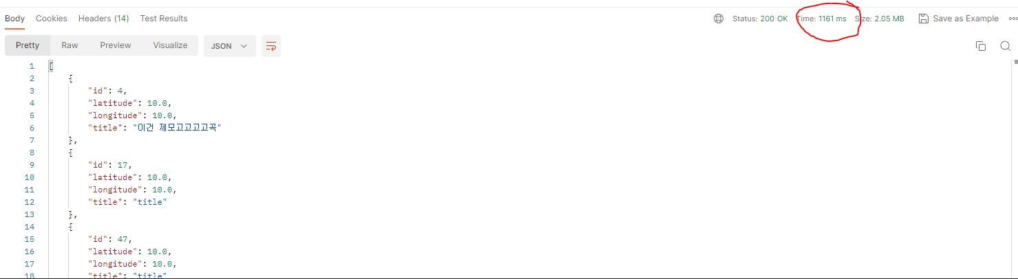 content는 "test"로, title도 "test"로, latitude도 longitude 등 memberId를 제외한 모든 필드 값이 고정되어 있다.