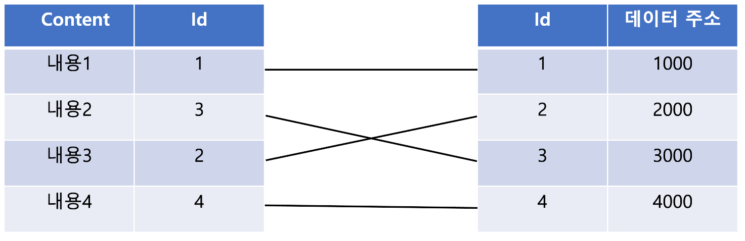 content 인덱스를 통해 Id를 알고 Id를 통해 '데이터 주소로 가서 데이터를 조회하는 것'이 바로 랜덤 엑세스이다.